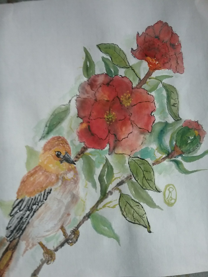 Singing Warbler on Camelia